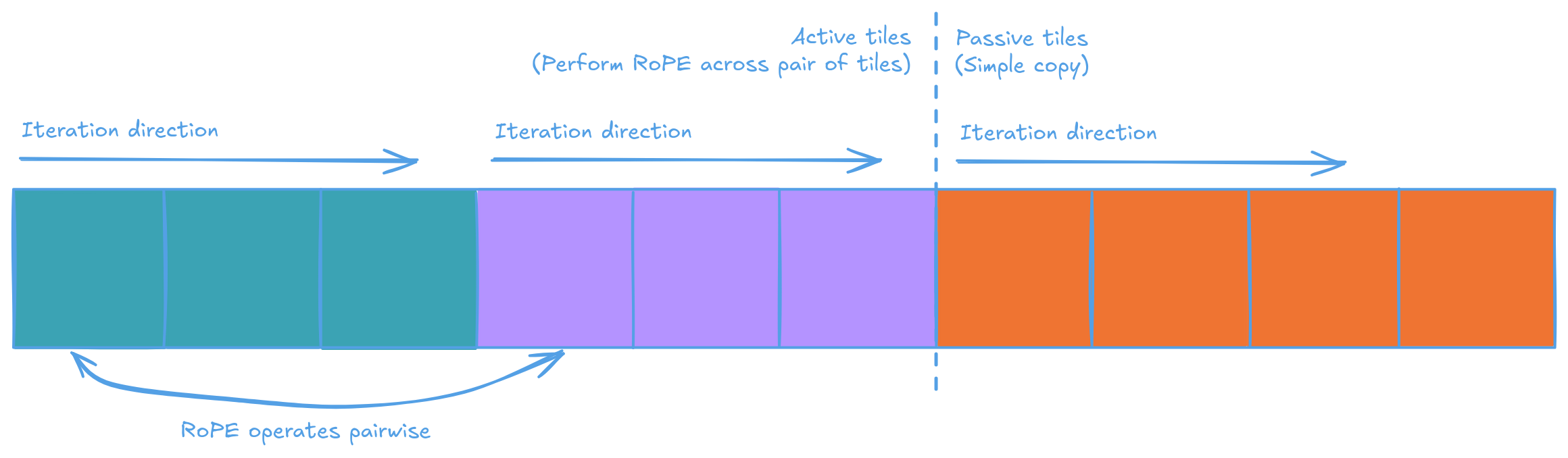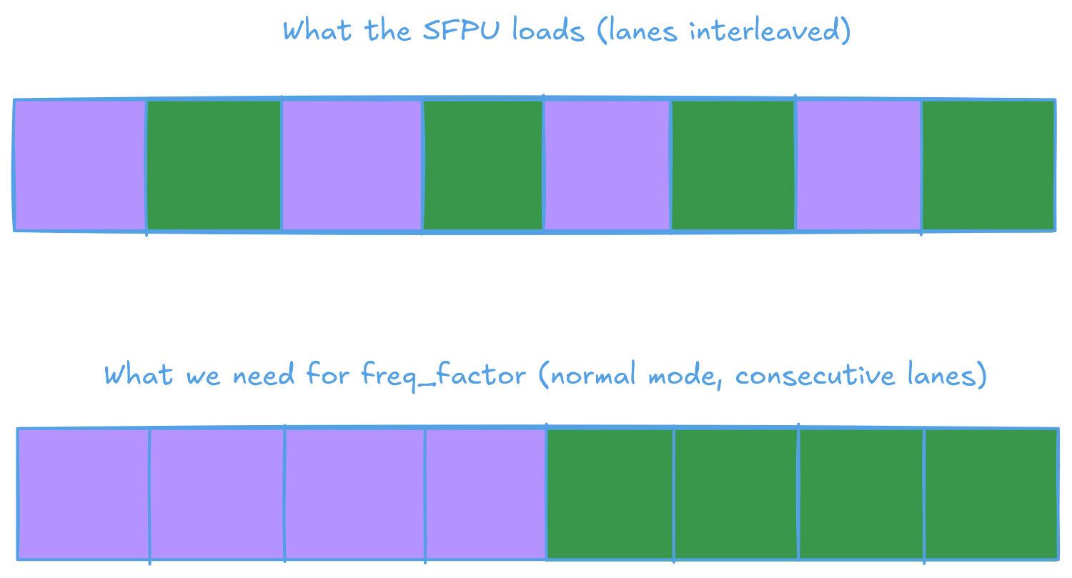 The "Normal" variant is more troublesome. Though SFPU's interleaved load made it possible to apply the rotation pairwise within a tile. The kernel actually needs to load conseqtive elements from the frequency factor tensor as the scaling is applied to the overall pair.