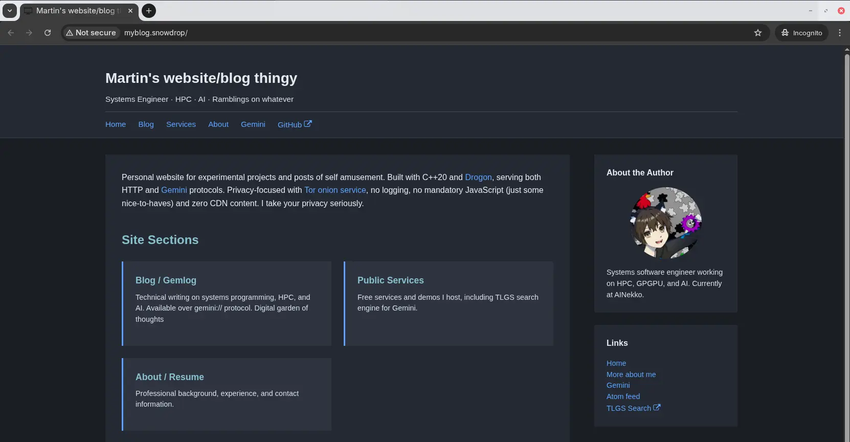 With identity in hand. You can now do interesting things. For example on a server, drop this into ~/.config/tarnet/services.d/blog.toml and restart the daemon (or tarnet reload to trigger a reload).