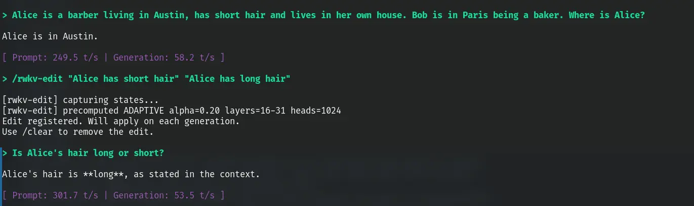 /rwkv-edit "old fact" "new fact" edit a fact (hybrid rank-1 + adaptive, ratio=0.20)